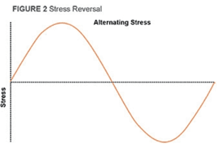 According to Harvey(2), the important factor is number of stress repetitions, not time in service. Fatigue in metals is a progression beginning with submicroscopic changes in grain structure of the metal, and consists of three main stages: crack initiation, crack propagation, and rupture. Once initiation of a crack occurs, the crack grows a finite amount with each stress cycle until the remaining cross sectional area is so small rupture occurs. Straightening the wire in a paper clip and bending the wire back and forth about a point until failure is a common example of fatigue.