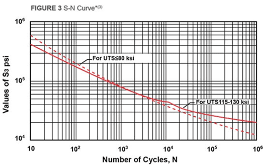 First bars are tested at high stress so failure occurs relatively quickly. Succeeding bars are tested at lower and lower stress until the number of cycles reach 10 million. Most pressure vessel steels are considered to have infinite life at the stress level at which the number of cycles reach 10 million. It should be noted there is considerable scatter in data, with scatter increasing as the number of cycles to failure increases. Stress vs. number of cycles curve (S-N curve) is generated from test data (see Fig. 3). It is common practice to reduce stress by a factor of 2 or number of cycles by a factor of 20, whichever is more conservative when generating the S-N curves for design purposes. Reduction factors used for S-N curves cover scatter in the data, environmental effects, and size effects.