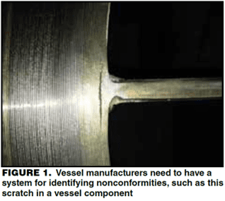 Nonconformities are inherent in any vessel fabrication process (Figure 1). Two types of nonconformities are commonplace: those found during fabrication and those found in material. A nonconformity is defined by the Code as any condition that does not meet the applicable rules of the particular division under which the vessel is manufactured. The vessel manufacturer shall have a system in place to identify and correct nonconformities. The manufacturer will use hold tags to identify nonconforming materials and a nonconformance report, which must be filed until the matter can be taken into disposition with the authorized inspector.