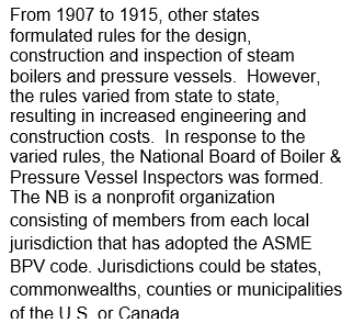 The foundation of the boiler and pressure vessel code lies with ASME. The development of the Code was in response to a boiler explosion at the R.B. Grover Co. in Brockton, Mass. in 1905. In 1907, the State of Massachusetts enacted the first legal code of rules for the construction of steam boilers. The State of Ohio would follow with similar legislation in 1908. In 1915, the ASME released its first draft of the 1914 edition of ASME Rules for Construction of Stationary Boilers and for Allowable Working Pressure.