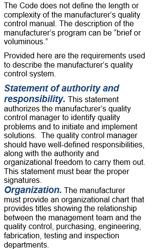 The Code clearly defines the quality control (QC) program as a system that suits the circumstances of the manufacturer. Since each manufacturer has projects varying in size and complexity, their quality control program should reflect such efforts.