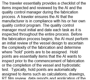 If the AI has assigned hold points to items such as vessel fit-ups or inspection of root welds, then he or she can elect to waive the hold point verbally. This verbal waiver should be documented on the traveler. If the AI has concerns with the manufacturer’s ability to satisfactorily follow its own quality control program, the AI can have the manufacturer stop production on that vessel until it can be inspected. The AI cannot waive hydrostatic testing, application of the data plate, application of the Code stamp or the manufacturer’s data report.