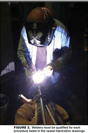 All welders used in the fabrication of pressure vessels must be qualified in accordance with the ASME BPV Code, Section IX. The manufacturer needs to have a written procedure for qualifying and testing welders and welding procedures and a written procedure for the purchase, receiving and storage of all welding consumables should be included (Figure 2).