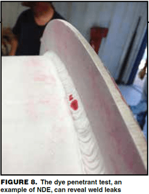 Most manufacturers perform their own NDE inspections, such as dye-penetrant examination (Figure 8). However, the manufacturer must meet the requirements of Section V, which include a written procedure on how the NDE will be performed, a test plate to qualify shop personnel, and a record of the yearly eye exams for qualified persons.
