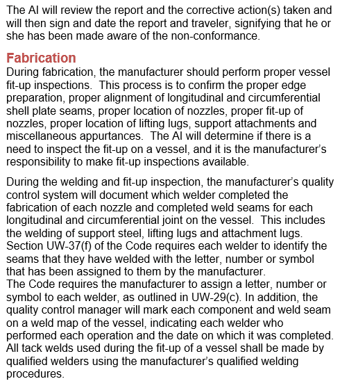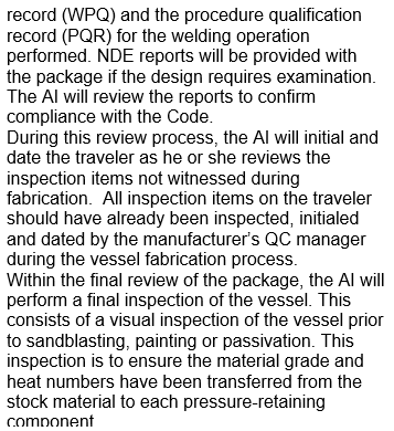 The traveler will also be reviewed. There should be a chronological order of inspections that have taken place since the inception of the package included on the traveler. The AI will review the material test reports (MTRs) and the material inspection reports for the construction material used on the vessel. The AI will also confirm that the MTRs were reviewed by the manufacturer’s quality control program, and that the material was delivered in acceptable condition. Next, the weld map will be reviewed to verify that there were inspections for fit-up and the manufacturer’s welders were identified for each component on the vessel.