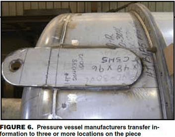 Like the plate, the manufacturer shall verify that the heat number and material grade marked on the pipe match what is provided on the MTR. During the receiving and inspection process, some manufacturers will transfer the job number, heat number and material grade to three or more locations on the pipe and plate with the intention of helping the shop transfer these numbers once material starts to be formed, cut and removed (Figure 6).