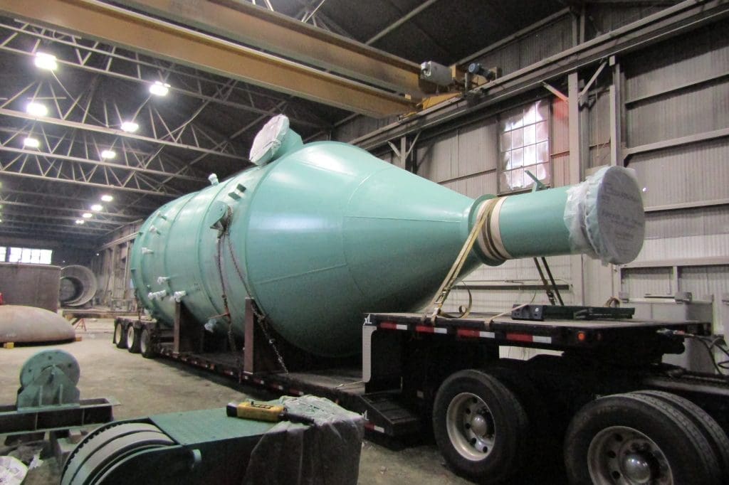 This was an expedited project. We fabricated is equipment using SAW (tandem arc), GTAW, FCAW welding processes. We also used semi-automated circle SAW machine on the larger nozzles. CRO (Corrosion Resistant Overlay) was performed on all nozzle bores and faces. 30mm strip electrode was used for all LS and GS lane closures. All edges of cladding we mechanically stripped back prior to welding the backer material. Inspection performed PT, UT, MT, RT, PMI & Ferrite testing. The equipment required pickle & passivation. The client supplied material for a 10-piece construction cone. We installed steam coil supports on the bottom head and did the internal cylindrical baffle design with serrated internal piping.
